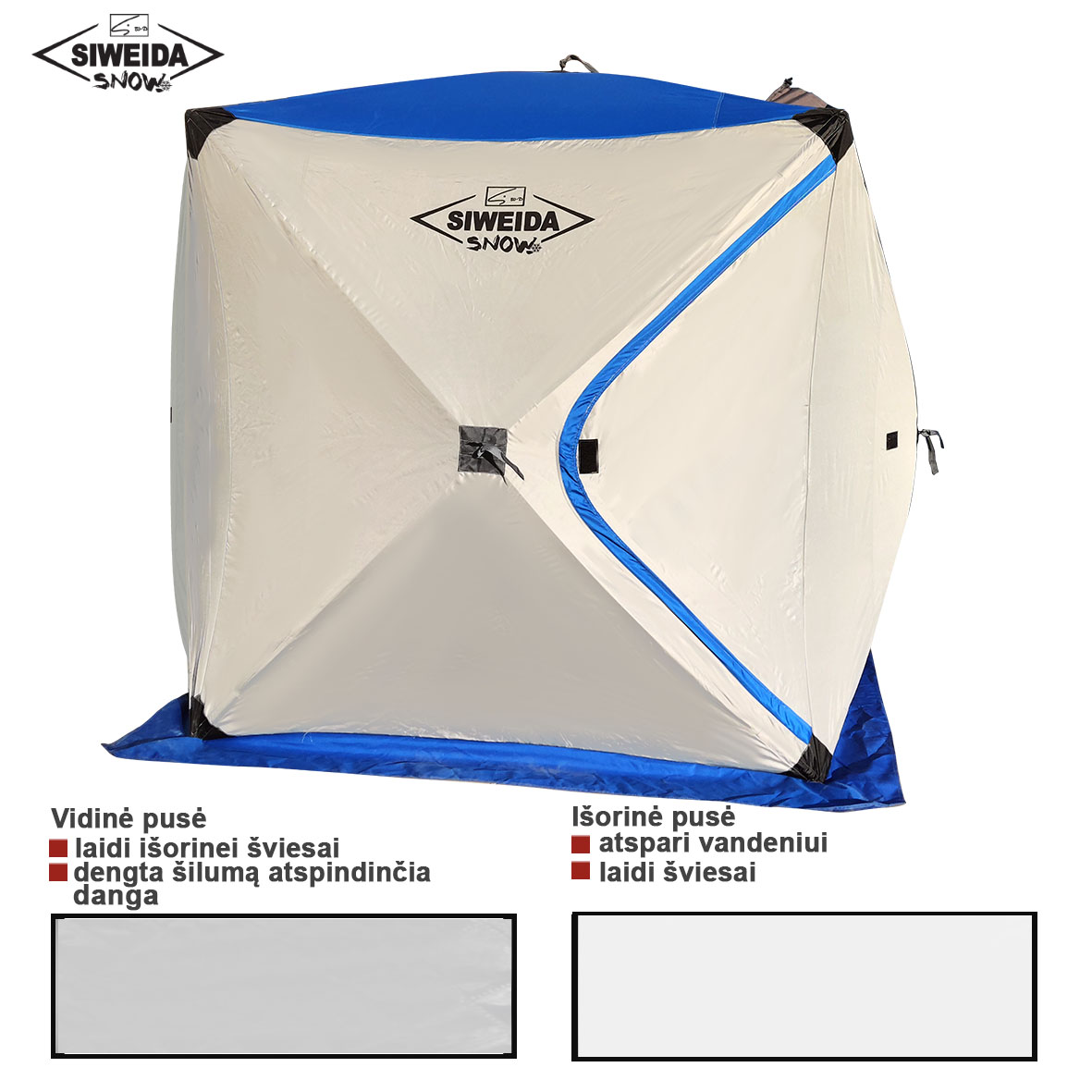 Siweida Kubas 200x200x220 – vienasluoksnė palapinė skirta apsaugoti nuo nepalankių oro sąlygų žiemos žvejybos metu.